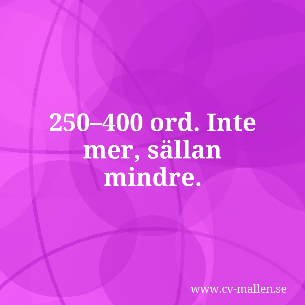 Spontanansökningar fungerar annorlunda. Utan en specifik annons att matcha mot blir ett långt brev lätt generiskt. Håll dig under 250 ord och lägg kraften på att förklara varför just det företaget, inte varför du i allmänhet är duktig.