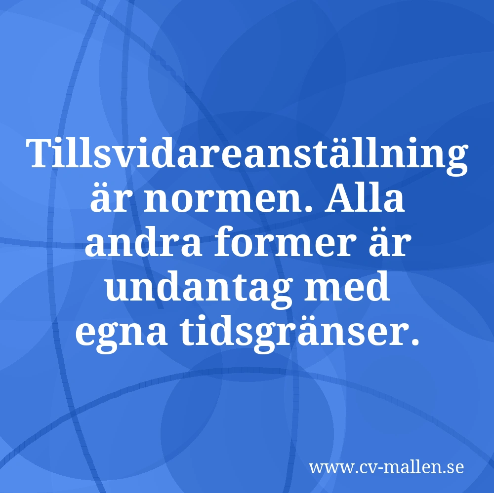 Tillsvidareanställning är huvudregeln enligt LAS. Tidsbegränsade former som särskild visstid, vikariat och säsongsanställning är undantag som får användas, men arbetsgivaren kan inte kringgå konverteringsreglerna genom att stapla olika former obegränsat.